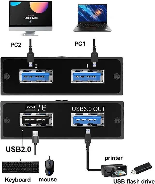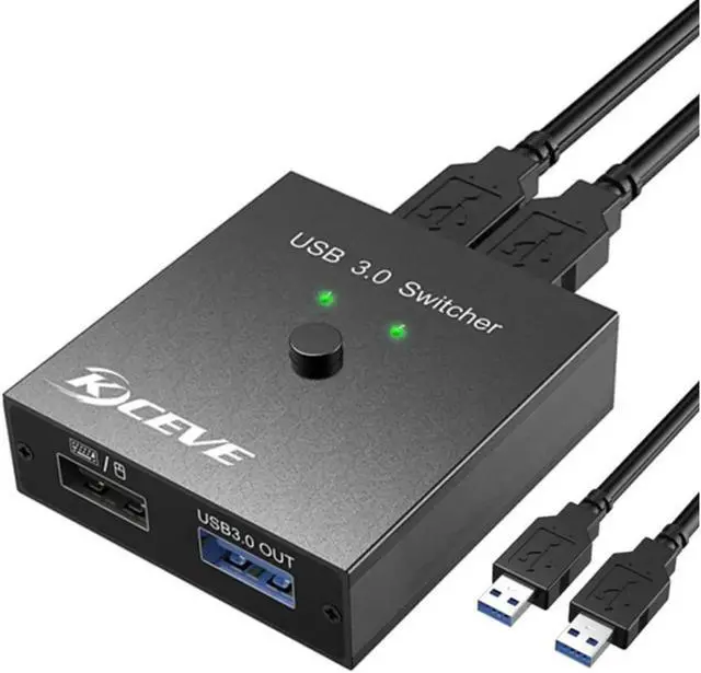 USB 3.0 switch for 2 computers, two computers can be switched freely via a button to share 1 USB 3.0 and 1 USB 2.0 peripheral devices. For example, it' s convenient for 2 computers to share printer U Disk, LED indicator allows you to know which computer is in control easily.