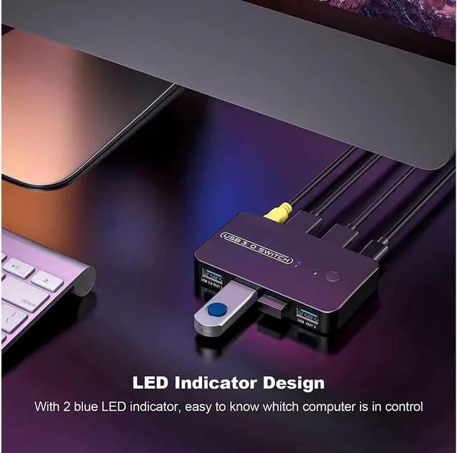 [LED Indicator Design] There are 2 LED indicators on the USB switcher. When you switch the computer, the corresponding indicator light will glow blue.