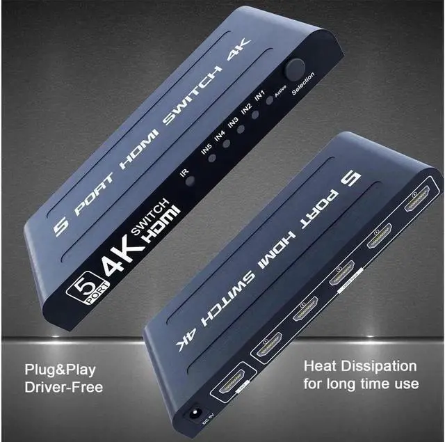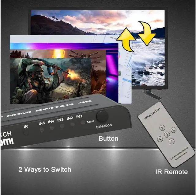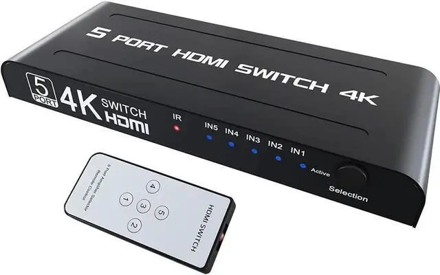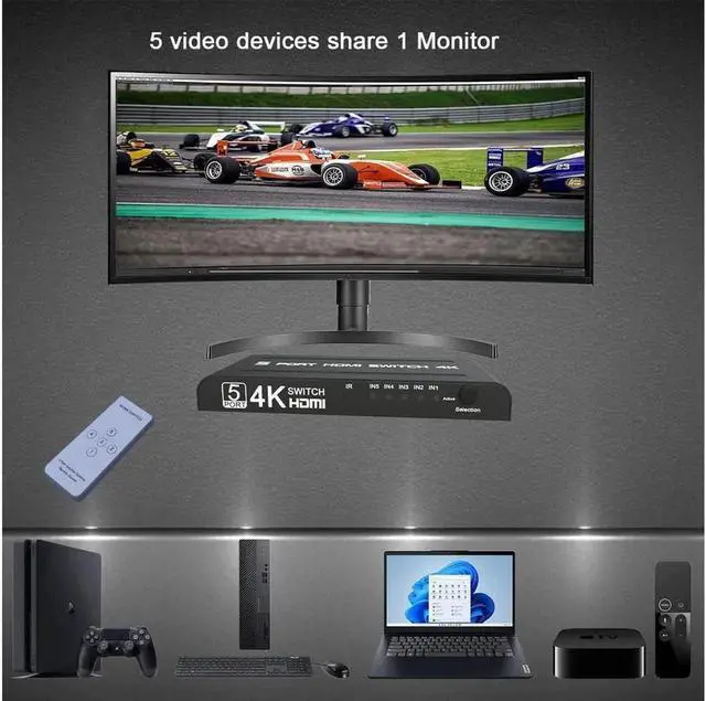 Out: 4K HDMI switch box enables you to stream video and audio from 5 HDMI devices to 1 HDMI display(Monitor, UHD Monitor, Smart TV, Projector etc.. ). Our HDMI switch 5 port has two ways to switch, manual switch and remote control. You never need to plug out and unplug in HDMI cables again.