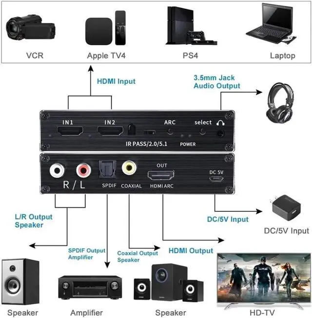 • 2 port HDMI Switch Audio Extractor with R/L+Toslink SPDIF+COAXIAL Audio Out Adapter 4K 60Hz HDMI ARC Audio Switcher 2x1 Selector