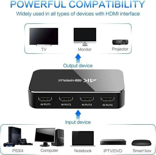 Wide Compatibility: The 4x1 HDMI-compatible switch with remote compatible with most HDMI-compatible device such as Amazon fire TV/ Apple TV/LE TV//VCD and DVD Player/ PS3/PS4/PS4 PRO Vedio Games/X-BOX one/ 360 /DVD/ Blu-ray DVD /PC/STB/Camera/Smart Box/Other Apple and Sony Devices etc