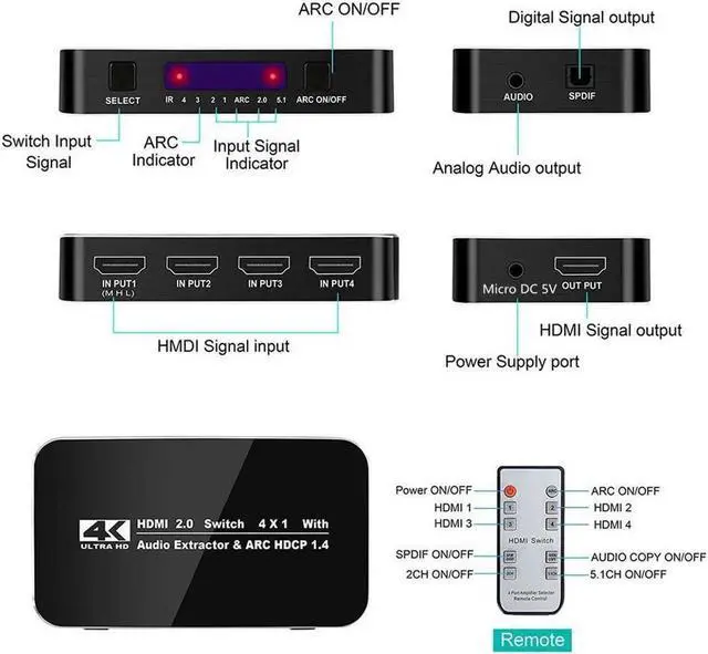 HDMI-compatible Switch: This 4 in 1 out HDMI-compatible switch can connect 4 signal sources to one HDMI-compatible display, supports HDR, HDCP 1.4, HDMI-compatible