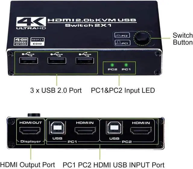 Plug and Play: Button switch signal source device, freely switch between 2 computers by pressing a button. Simple to install, plug and play, no driver is needed. Powered by