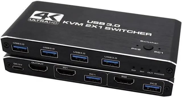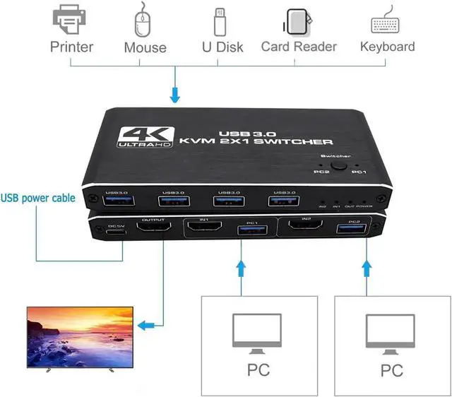 • USB KVM Switch USB 3.0 Switcher HDMI-compatible KVM Switch 2 In 1 Out 4K for 2 PC Sharing Keyboard and Mouse EDID / HDCP Printer