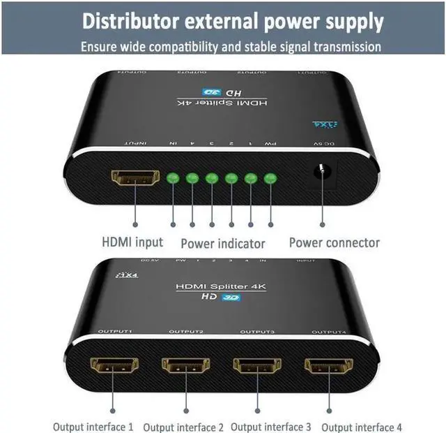 2. The HDMI splitter uses an HDMI cable (need to be purchased separately) to connect the HDMI signal source to the input of the splitter, and the output has 4 HDMI outputs.