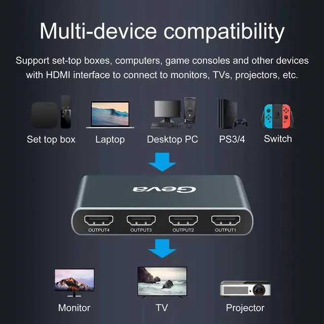 • HDMI-compatible 2.0 Splitter 1 in 4 Out 4K@60Hz HD 1x4 Splitter SST Duplicate/Mirror Adapter for PS4 Xbox Switch PC Laptop HDTV