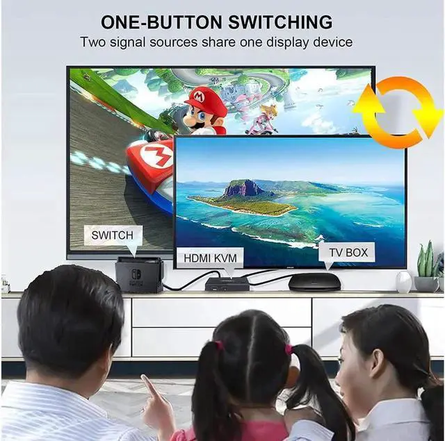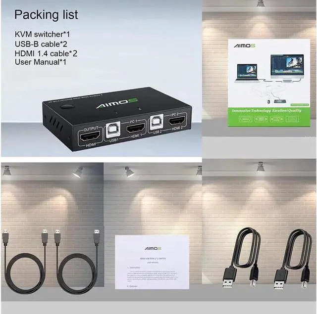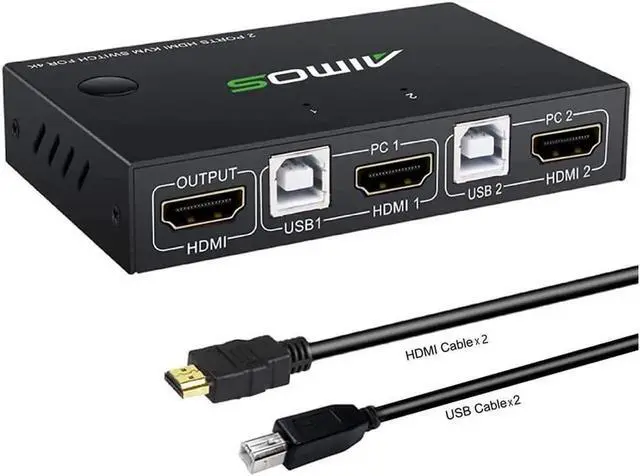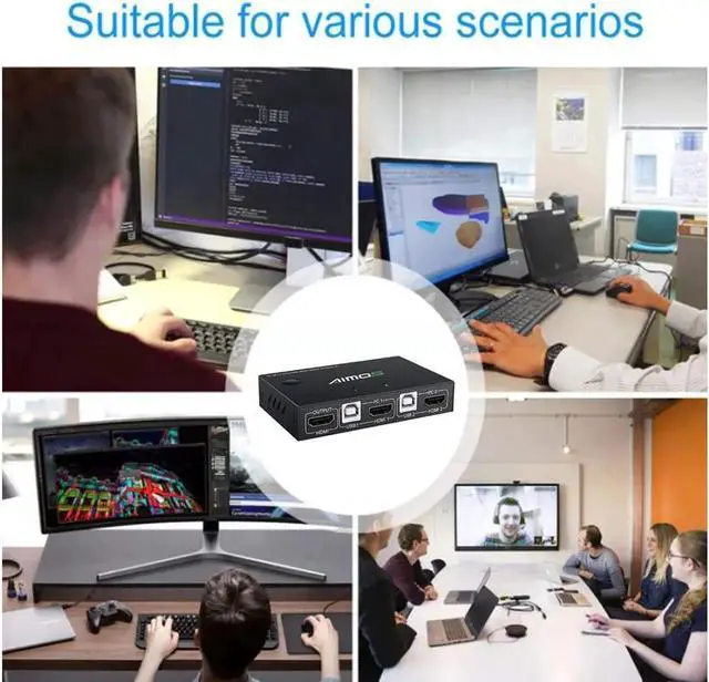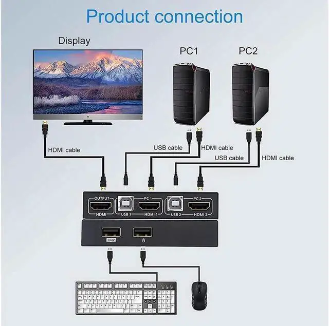 [KVM Switch HDMI 2 Port Box] KVM switches allow you to control 2 computers with one set of mouse and keyboard, 2 computers share one monitor, you can switch between the two computers at will. high-precision encryption chip, gold-plated interface.