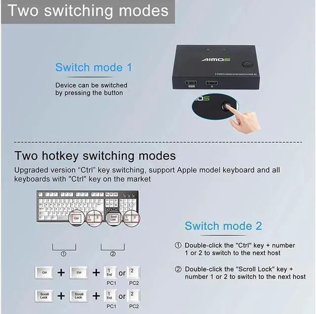 [Hotkey Switch and Wireless Device] This KVM Switch support host button switch and hotkey switch, quickly switch between 2 sources by keyboard (two hot key: Ctrl + Ctrl + 1 / 2, Scroll Lock + Scroll Lock + 1 / 2), LED light indicating the active computer. powered by USB, support wireless keyboard and mouse.