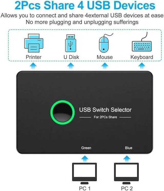 [One-Botton Switch with LED] Button and LED design, you can easily switch between systems via push buttons. Green LED indicating the active PC1 and blue lights show you the PC2 is working. The indicator light is not dazzling at night, so it will not disturb your working or sleeping.