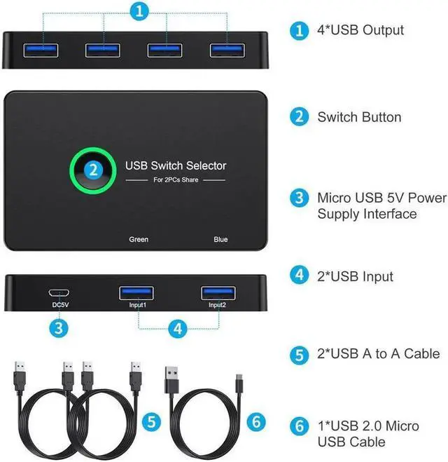 [What You Get] 1 x keyboard and mouse kvm switch, 2 x USB 3.0 A female to A female Cable, 1 x micro usb charging cable, 1x User Manual..