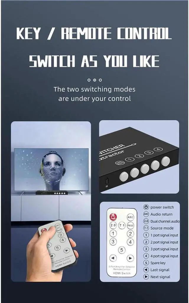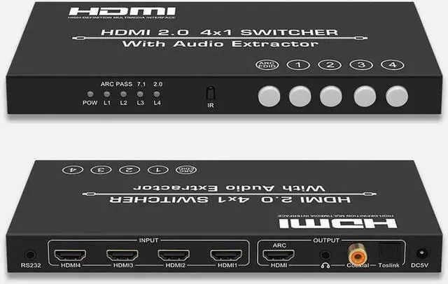 2.0 Switch 4K@60HZ HD 4 Port HDMI Switcher 4 In 1 out Audio Separation with 3.5mm Analog Audio Digital Fiber Coaxial Port Remote Control