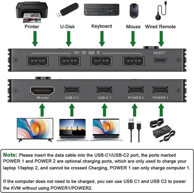 • USB Type-C KVM Switch 2 In 1 Out 4K USB HDMI KVM Switch Support PD Charg for 2 Computers Share 1 Monitor and 4 USB Devices
