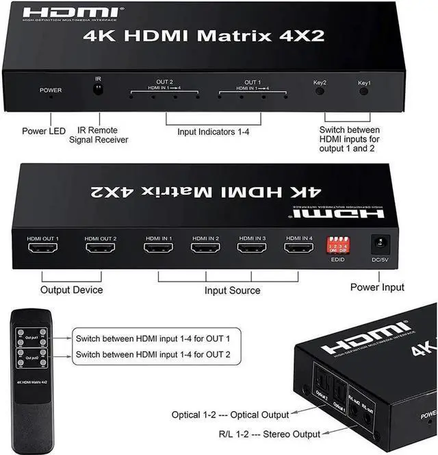 [4 IN 2 OUT Matrix] This HDMI Matrix can connect up to 4 HD Source to 2 HDMI Display terminals with optical fiber or stereo headphone output, it allows four HDMI devices to be switched or split easily to two HDMI compatible monitors or projectors.