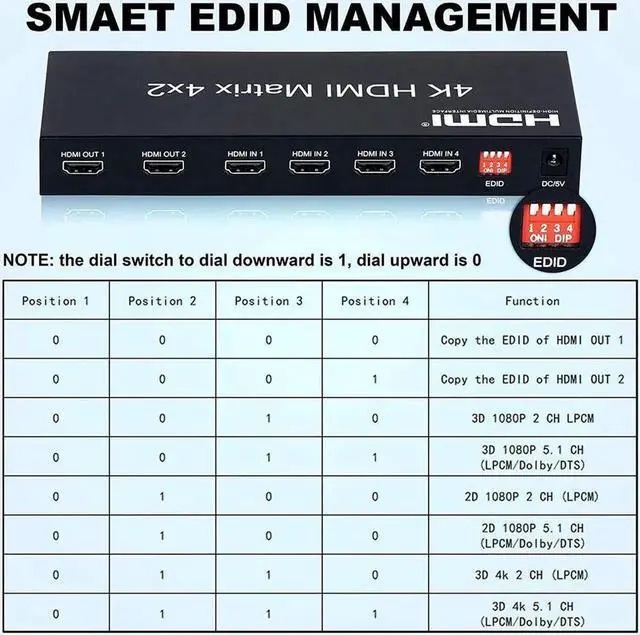 [Audio Split&EDID] Supports LPCM/DTS 5.1 channel/Dobly Digital(Does' t support Dobly DD / DD+ / Vision). Smart EDID management (Please refer to the picture for EDID setting). Any input HD source can do audio extract by the SPDIF or 3.5 mm headphone audio output port separately or at the same time.