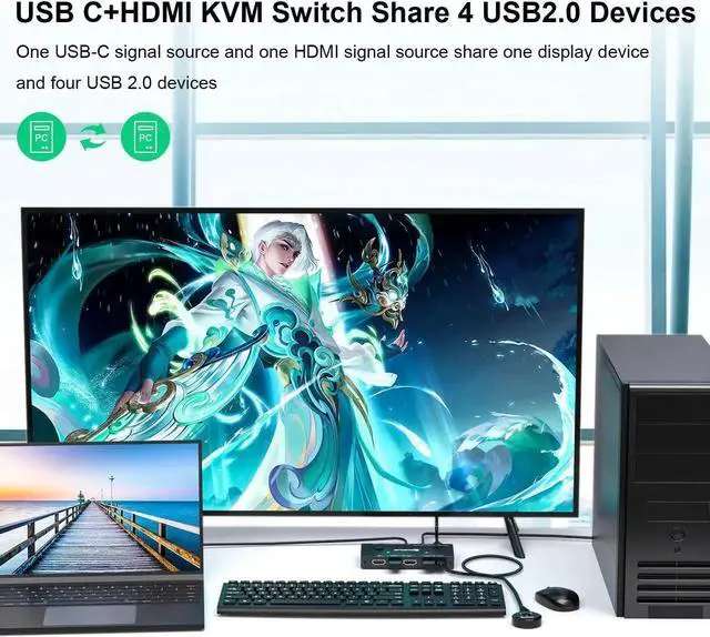 • USB Type-C KVM Switch 2 In 1 Out 4K USB HDMI KVM Switch Support PD Charg for 2 Computers Share 1 Monitor and 4 USB Devices