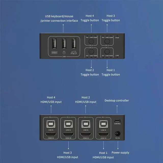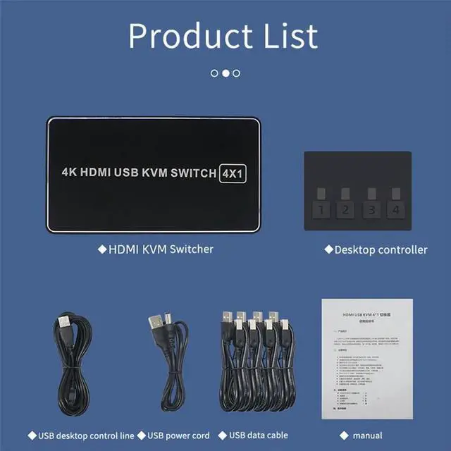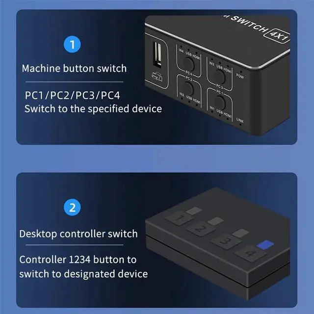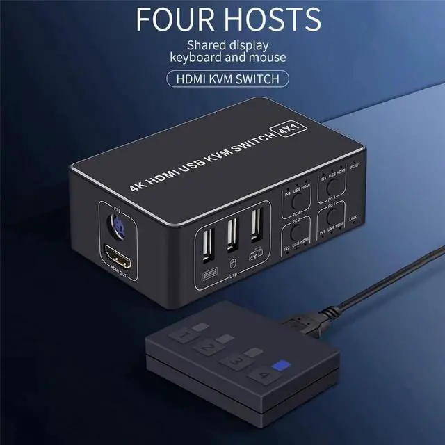 • 4 Port 4K USB HDMI-compatible KVM Switch Switcher 4 in 1 Out Selector Connector Control up to 4 Monitor Mouse Keyboard PC Laptop