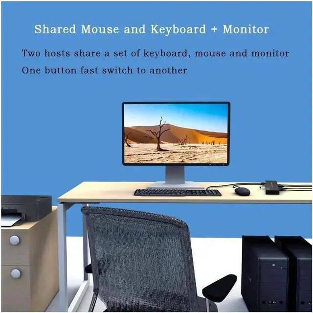 2 computers share one set of keyboard and mouse and monitor, 4 USB 2.0 devices for one button swapping. Saving your space, make your work and life easier and smarter.