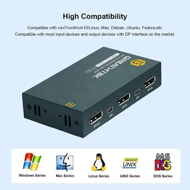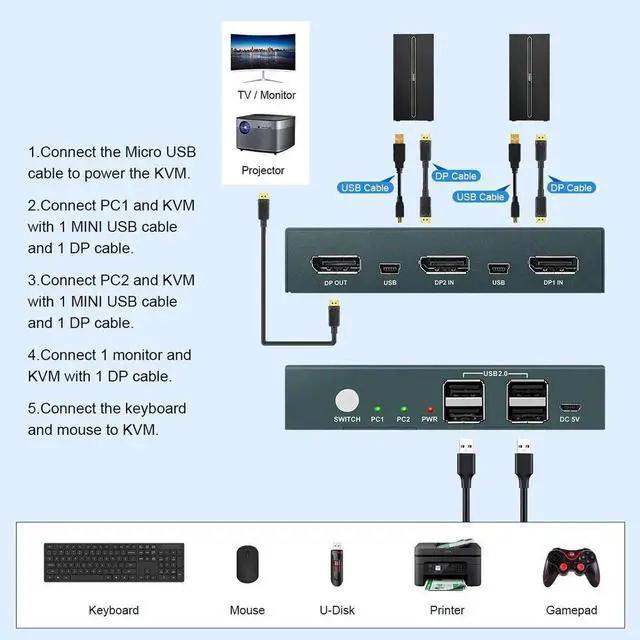 • USB KVM Switch Keyboard And Mouse Splitter With 2 DP Port Support 4K@60Hz 2 In 1 Out and USB Hub For PC Macbook Laptop