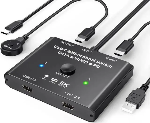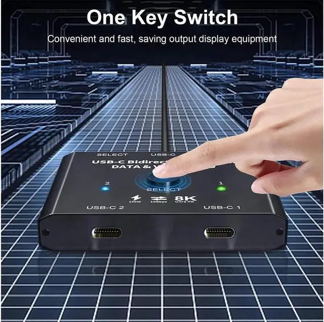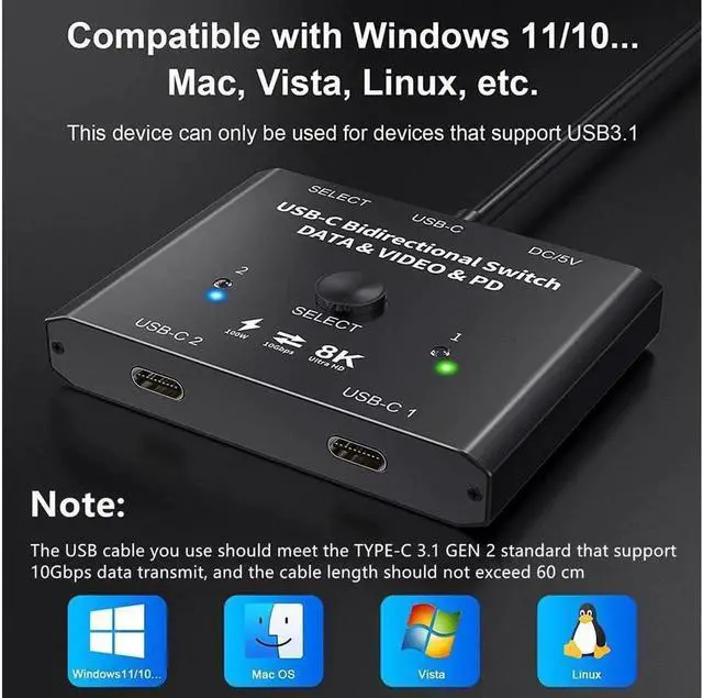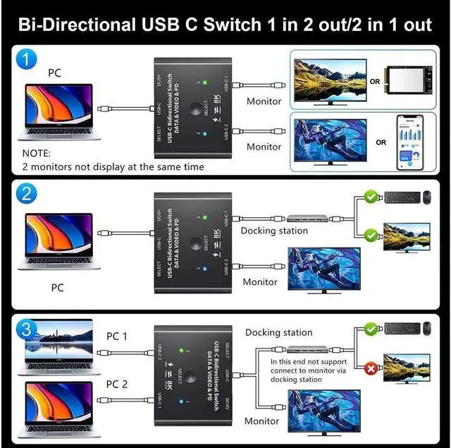 [8K UHD USB-C video switcher bidirectional[ USB-C switch 2 in and 1 out, use for 2 computer inputs, 1 monitor output, or 1 computer input, 2 monitor outputs. Support output resolution up to 8K@30Hz 4K@120Hz, backward compatibility 1080P.