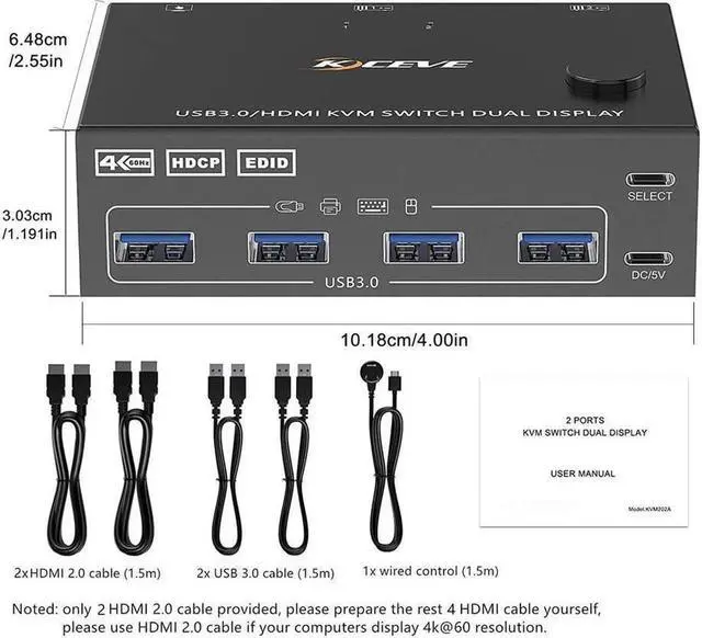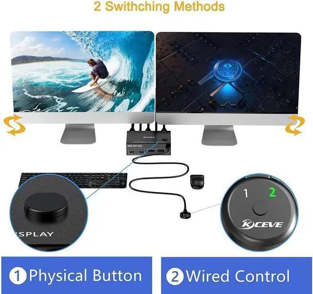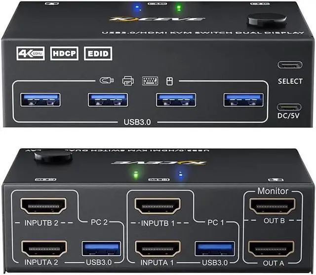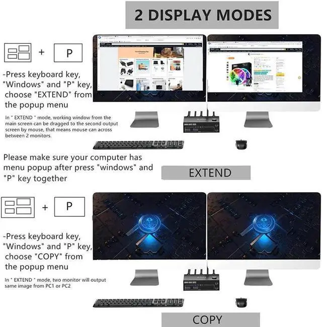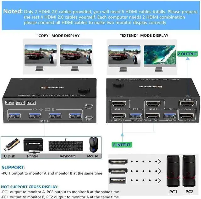 [Dual Monitor KVM USB 3.0 Switch] This Dual Monitor HDMI KVM switch can control 2 computers to share 2 monitors by 1 set of USB keyboard & mouse. When in copy mode the main screen can be copied to the secondary screen. When in extend mode, the window from main screen can be dragged to second screen.