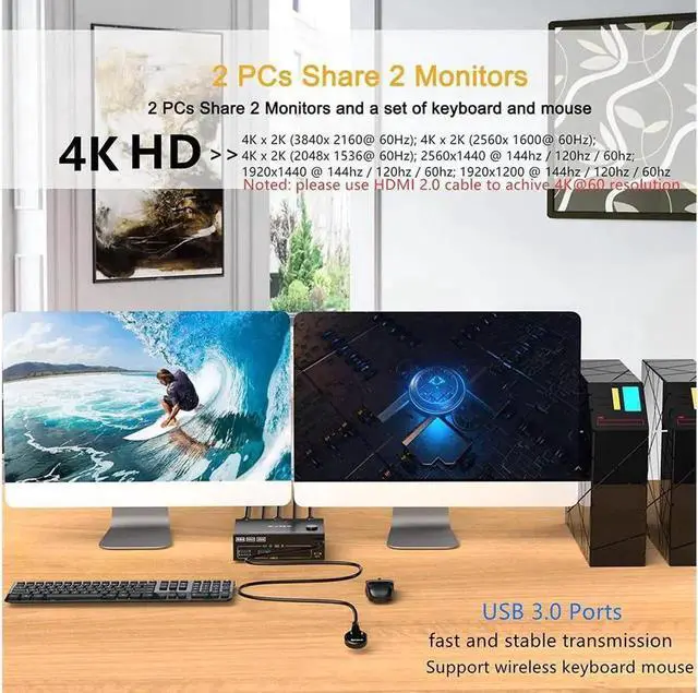 [With 4 USB 3.0 USB Ports] This 2 in 2 out KVM USB 3.0 switch with 4 USB 3.0 port for sharing mouse, keyboard, USB printers, scanners, etc,. USB 3.0 transmission is more stable and faster.