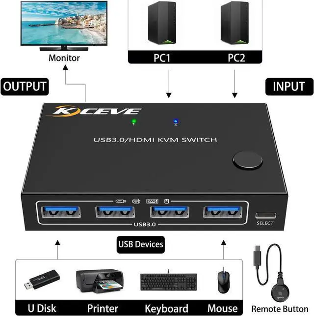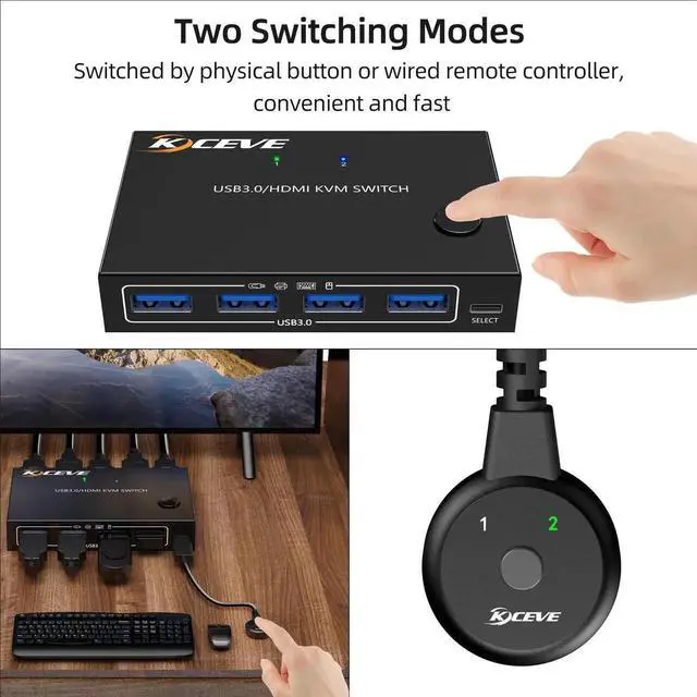 • KC-KVM201A USB3.0/HD 2 in 1 out KVM Switcher Support up to 3840*2160@60Hz Resolution One-button Switching for Mouse Hub