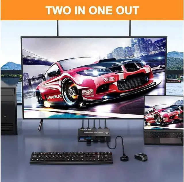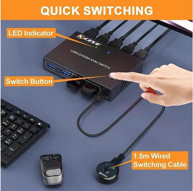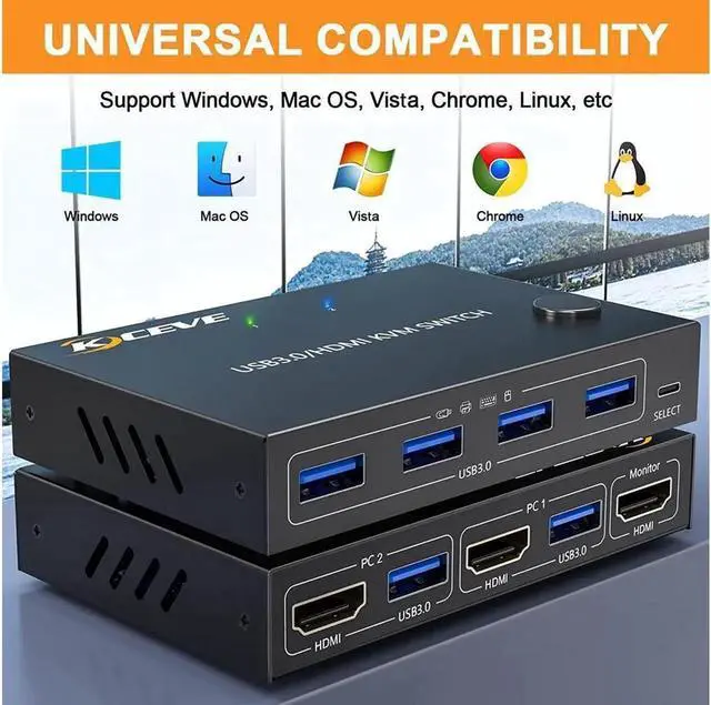 [HDMI KVM Switch 2 PC Share 1 Monito] This KVM Switch 2 ports can realize 2 computer inputs 1 display output, connect up to 4 USB 3.0 devices. The USB KVM switch allows 2 PC, 1 monitor to share, controlled by a set of wired/wireless mouse and keyboard, also supports printer, scanner, webcam.