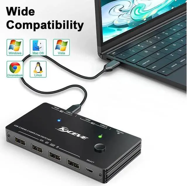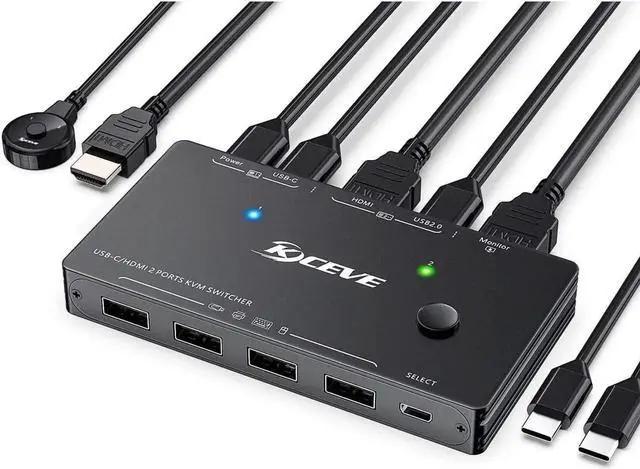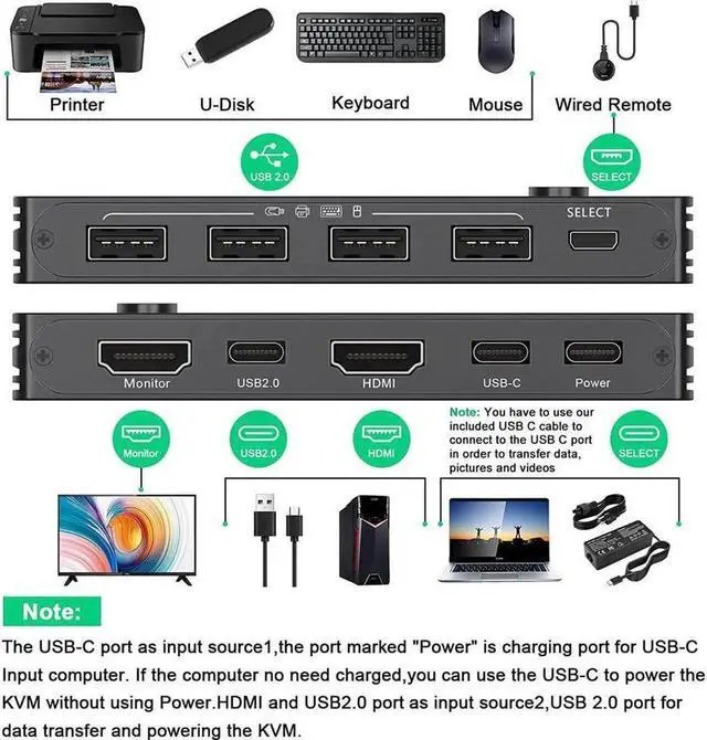 [2 Ports USB C HDMI KVM Switch] This Type-C HDMI KVM switch can easily switch between 1 Thunderbolt 3 or USB C laptop and HDMI input computer, sharing 1 set of wired/wireless keyboard, mouse, printer, U disk and 1 HD monitor. 1 Type C input+HDMI input, 1 HDMI output.