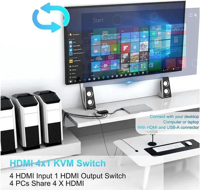 [4K KVM Switch HDMI 4 Port] This hdmi and usb switch can switch 4 computers with only 1 (monitor, keyboard, mouse), you can control four computers on one monitor, hdmi usb switch allows your Cleaner desktops and more efficient work.