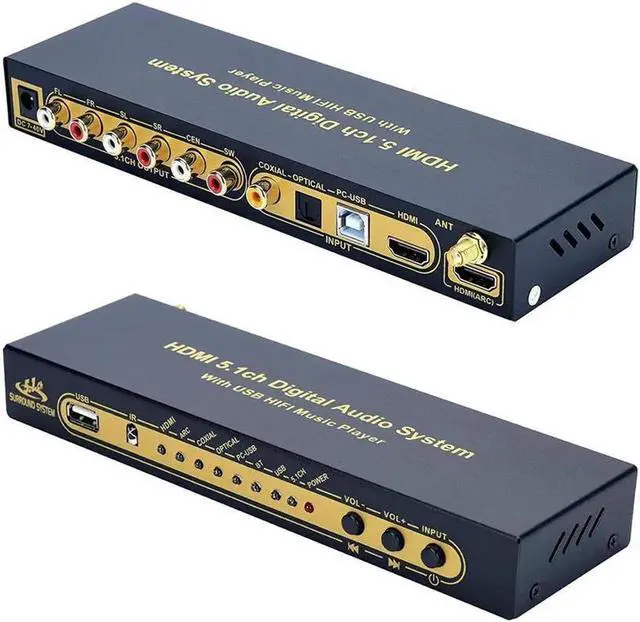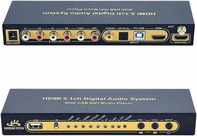 All signal sources ( HDMI / ARC / COX / OPT / PC-USB / U disk-USB / BT- 5.0 ) can decode to surround 5.1 ch or F/L 2.1 ch output. Support 192Khz/24Bit playing.