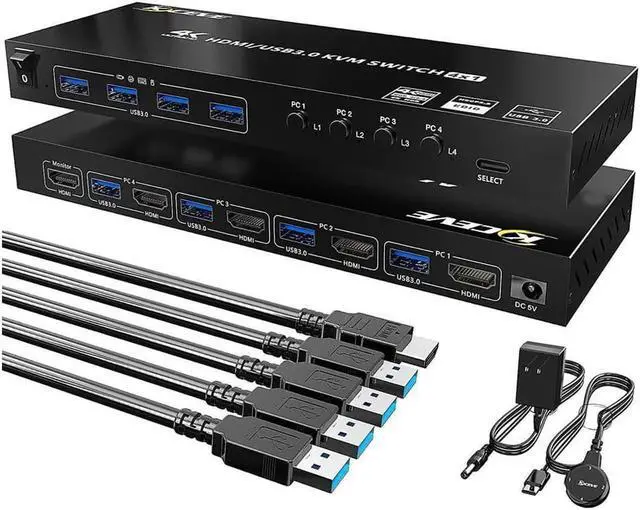 • [USB3.0 HDMI KVM Switch 4 in 1 out] This KVM switch allows to control 4 computers with only one set of monitor mouse and keyboard. Making easily switch between 4 computers on 1 monitor and share 4 USB 3.0 devices.