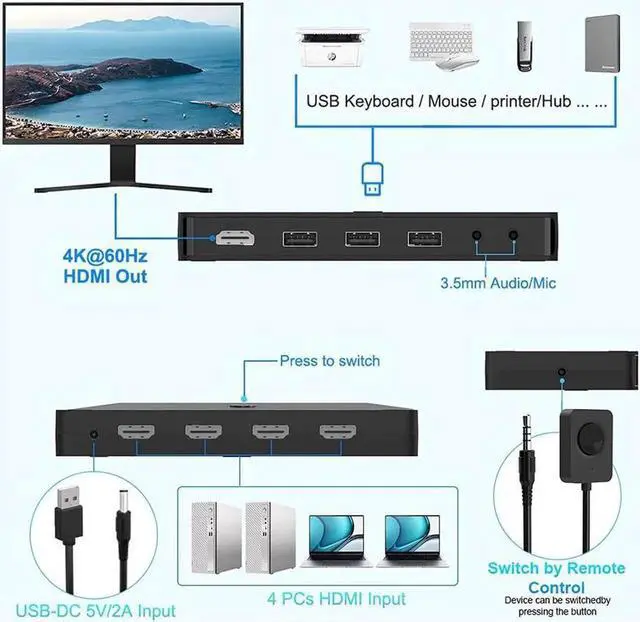 [4K KVM Switch HDMI 4 Port] This hdmi and usb switch can switch 4 computers with only 1 (monitor, keyboard, mouse), you can control four computers on one monitor, hdmi usb switch allows your Cleaner desktops and more efficient work.