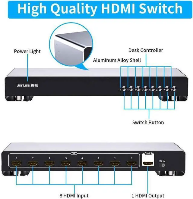 • 4K HDMI Switch 8 In 1 Out Video Switcher 8 Ports for Host Laptop PS3/4/5 Xbox Sharing Monitor TV Projector