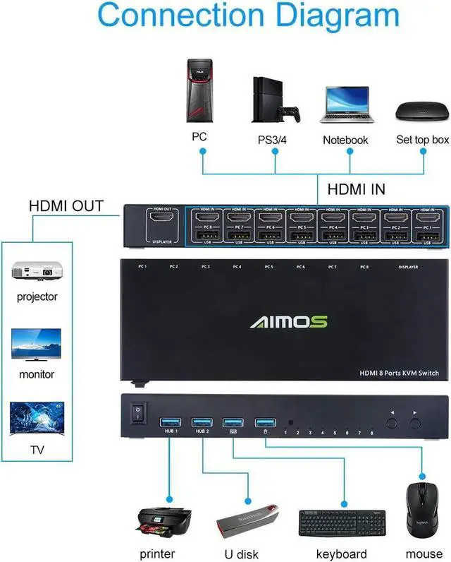 • 8 in 1 HDMI KVM Switch, Out Switch Active Monitor Mouse Keyboard HDMI Switcher 4K @ 30Hz for Laptop, PC, PS4, Xbox