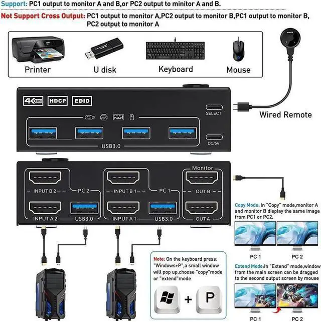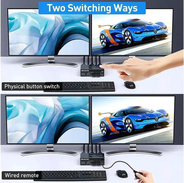 [Dual Monitor KVM Switch] This Dual Monitor KVM Switch allows to control 2 computers by 1 set of keyboard & mouse and 2 monitors (Extend display mode or Copy display mode).