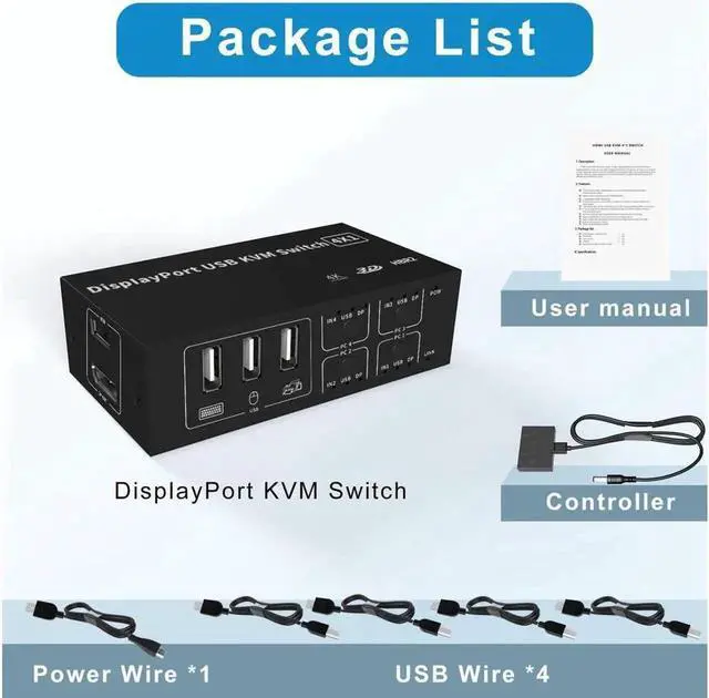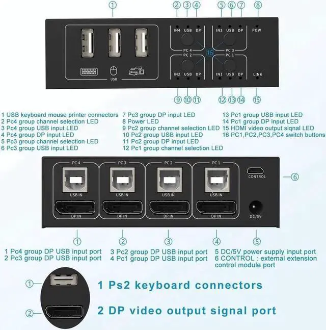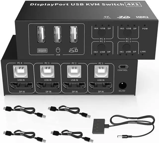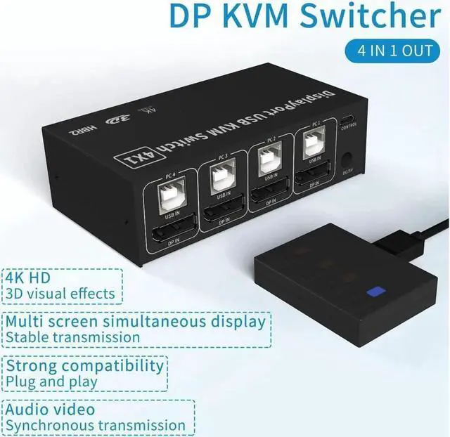 [4 In 1 Out Displayport KVM Switch ] 4 In 1 Out--The USB 4 port of the DP KVM Switch can help you to control 4 signal sources easily with just one set of USB keyboard and mouse console and to share 1 monitor.