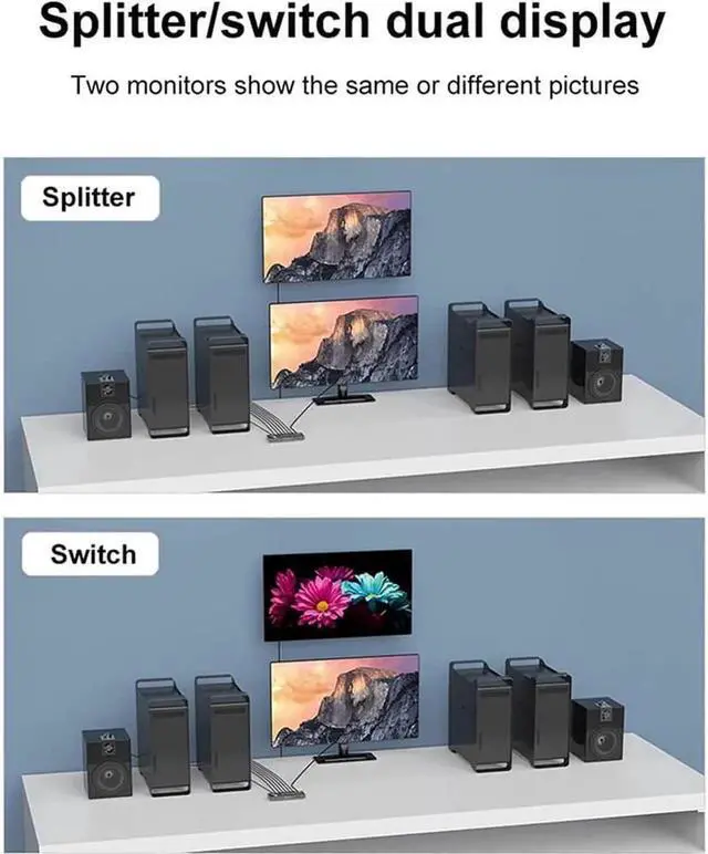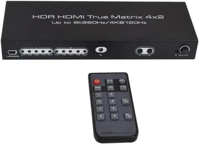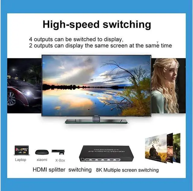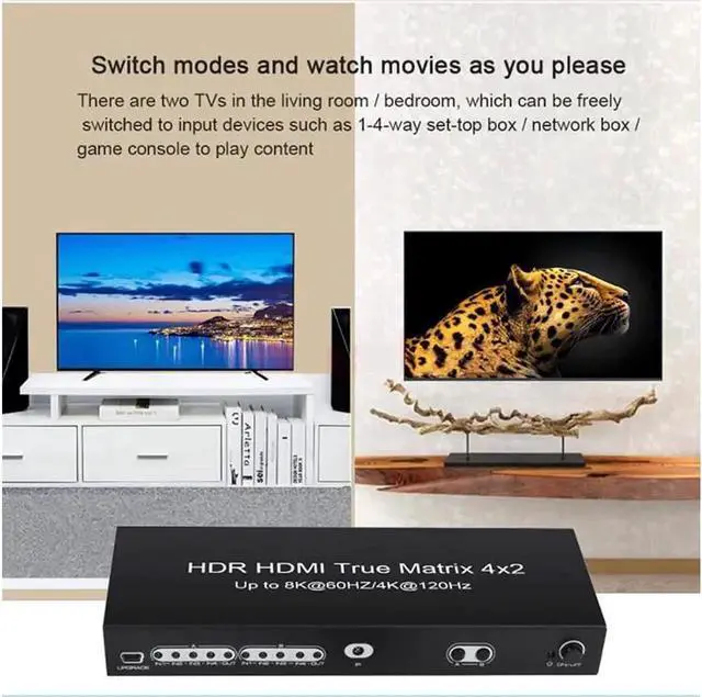 This 8K 4x2 HDMI matrix switcher with HDMI 2.1 expands the bandwidth to 48 Gbps and connects 8K/HD TVs to Blu-ray/DVD players, Xbox, Play Station, PC and other HDMI devices.