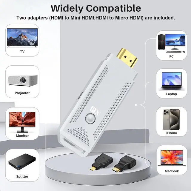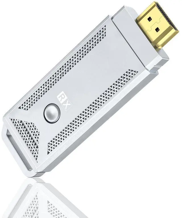 • Function of Transmitter: The transmitter connects to the source device, such as a mini PC, via a USB or HDMI port. It sends the signal out wirelessly.