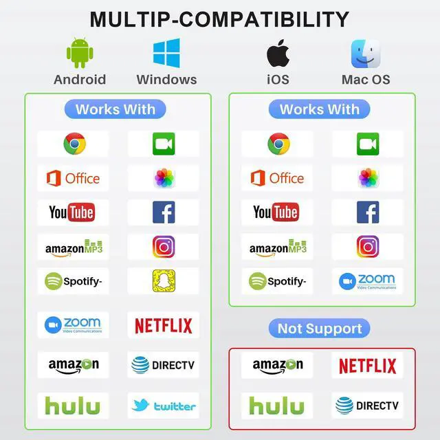 • HDCP Support: Stream content, including movies, from your iPhone, iPad, and MacBook by connecting the HDMI Wireless Adapter to most TVs and projectors. Note: Certain paid subscription apps and apps protected by HDCP copyrights, such as Netflix and Amazon Prime Video, are not supported on Apple devices but are supported when using other non-AirPlay devices