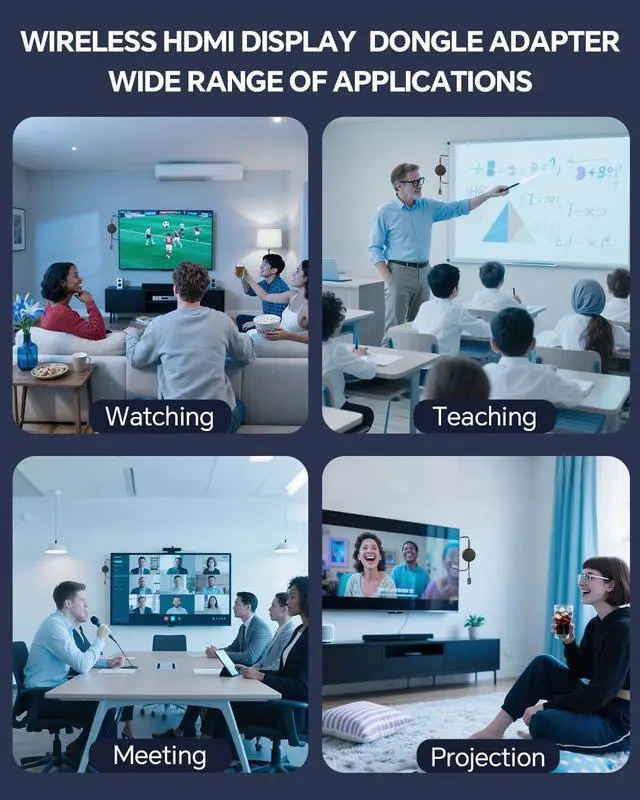 Wireless HDMI Display Adapter for Easy StreamingStream HD video, movies, apps, photos, and presentations from your iPhone, Android phone, laptop, or tablet directly to your TV or projector. This wireless HDMI dongle eliminates messy cables and delivers smooth, stable screen mirroring for home entertainment and business use.