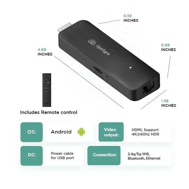 9. Does it support 4K resolution? Yes, the OptiStick Digital Signage Player supports up to 4K output, delivering crisp, professional visuals on compatible displays.