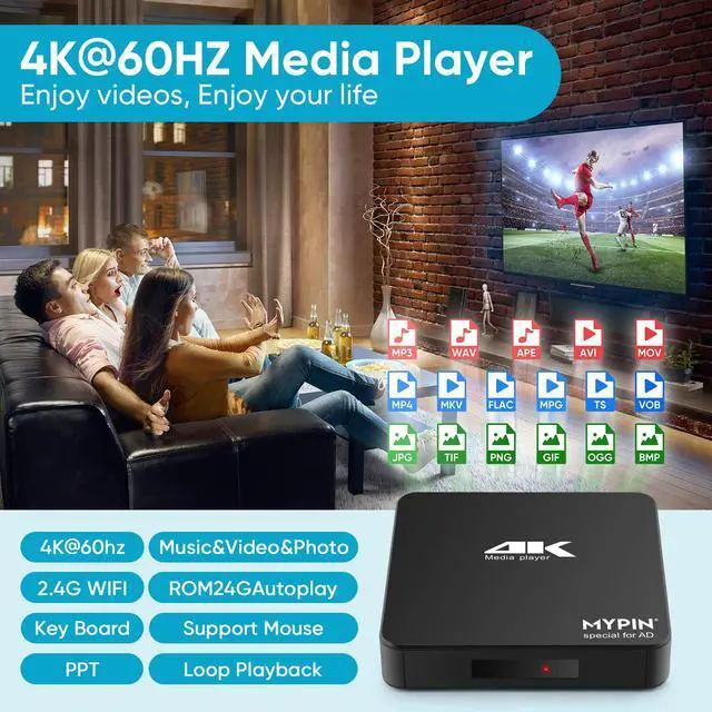 | Package | 1x 4K HD Media Player, 1x Power Supply, 1x AV Cable , 1x HDMI 2.0 Cable , 1x Remote Control (work with AAA battery, not included) , 1x User Manual |
