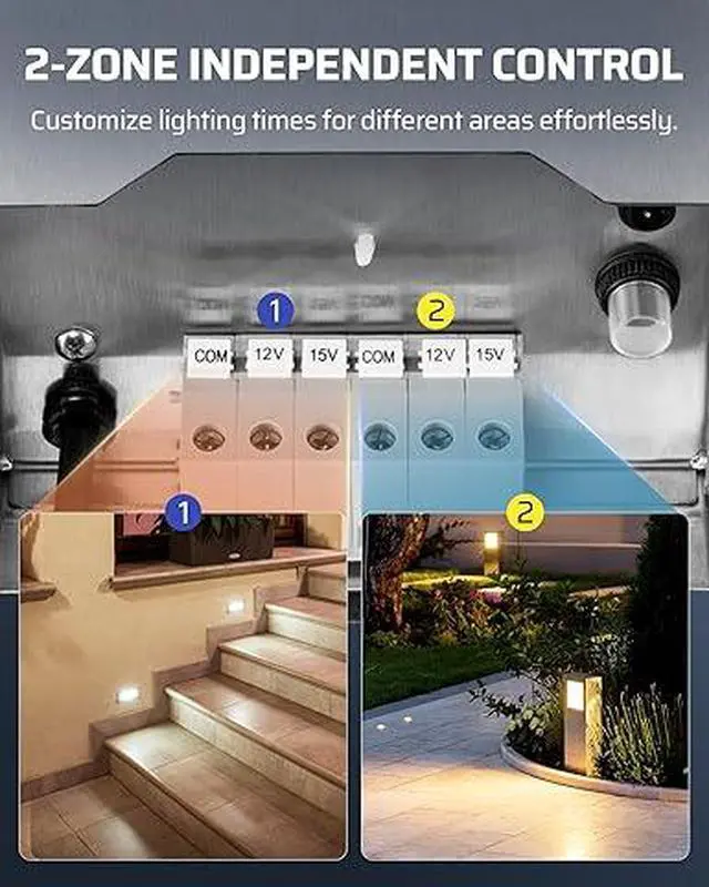 [Dual-Zone Independent Control] Converts 120V AC high voltage to safe 12V/15V AC, landscape transformer has two independently controlled zones for LED landscape lights, spotlights, in-ground lights, step lights, and pathway lights while saving energy and minimizing electric shock risk