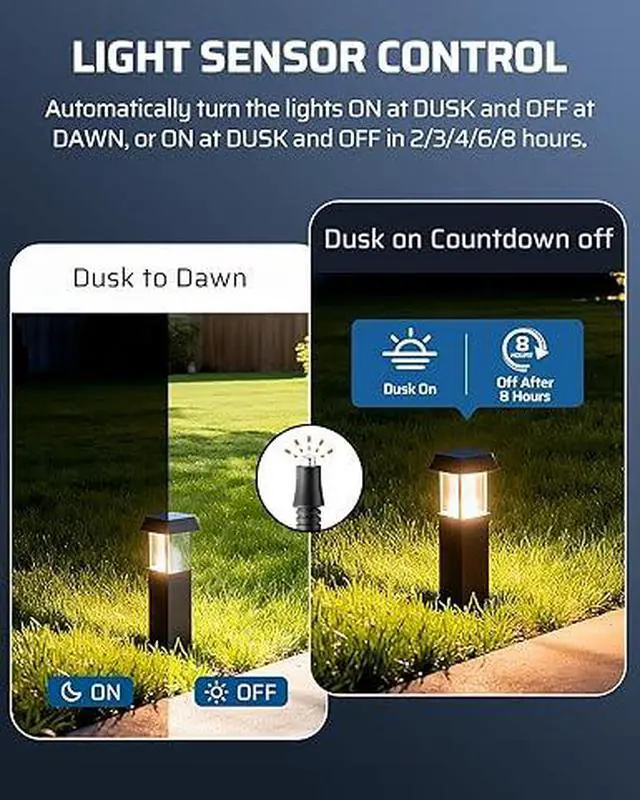 [Sunset On & Countdown Off] Easily set countdown modes (2/3/4/6/8 hours) with one button; the outdoor landscape transformer automatically activates at dusk and powers off after the selected time; and the memory function retains your last setting even after a power outage
