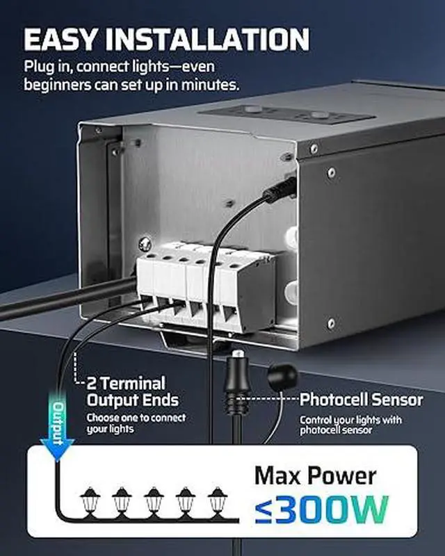 [Dusk-to-Dawn Automation] Equipped with an external photocell sensor and a 5.9ft replaceable power cord, this landscape lighting transformer automatically turns lights on at sunset and off at sunrise, providing effortless lighting control and flexible positioning
