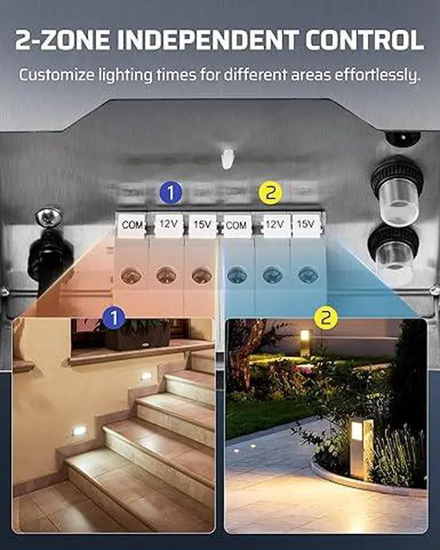 [Dual-Zone Independent Control] Converts 120V AC high voltage to safe 12V/15V AC, low voltage landscape transformer has two independently controlled zones for LED landscape lights, spotlights, in-ground lights, step lights, and pathway lights while saving energy and minimizing electric shock risk