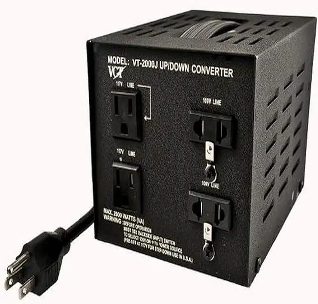 This continuous use transformer is capable of both up and down voltage conversions for Japan and USA electricity to enable use of Japanese products in USA and USA products in Japan
