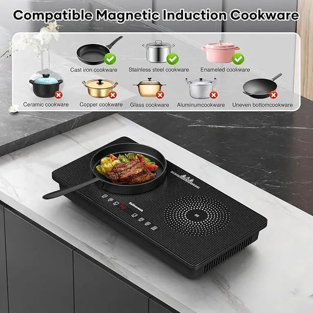 Compatible with Induction Cookware Only Works with magnetic cookware such as cast iron and stainless steel. Not compatible with aluminum, copper, glass, or ceramic cookware. If incompatible cookware is used, an E0 warning may appear.
