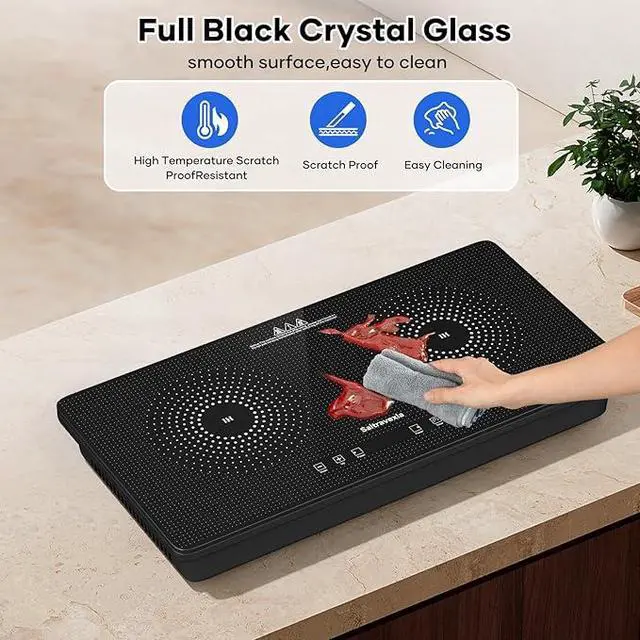 Built-in Safety Protection & Easy Cleaning Designed with child safety lock, timer, and overheat protection. The smooth glass surface stays cool around the cookware area and is easy to clean after use.
