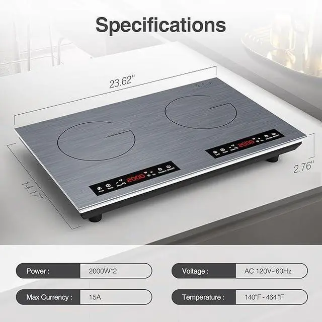 DUAL HEATING ZONES:VBGK double induction cooktop features two independent heating areas and independent LED display. Each burner is 2000W which can cook 2 dishes quickly at the same time. The induction cooktop 2 burner uses 110-120 Volts of electricitystandard in all North American homes. With wire drawing ceramic glass design, the 2 burner induction cooktop looks very modern sleek.